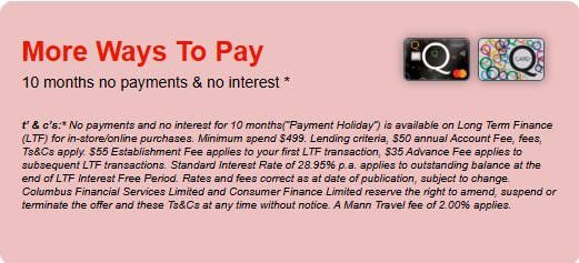 **Indicative [Weekly/Monthly] Repayments: ^Approved applicants only. The indicative monthly repayment is the purchase amount and Establishment Fee divided by the number of weeks in the Start-up Interest Period. The indicative repayments assume there are no additional purchases, cash withdrawals, fees or charges. The indicative repayments are only an estimate and figures should be used as an indication only. They do not represent either a quote or pre-qualification or approval. To repay the purchase amount by the expiry of the Start-up Interest Free Period, the indicative monthly repayments stated would need to be made by the due date for each statement period.